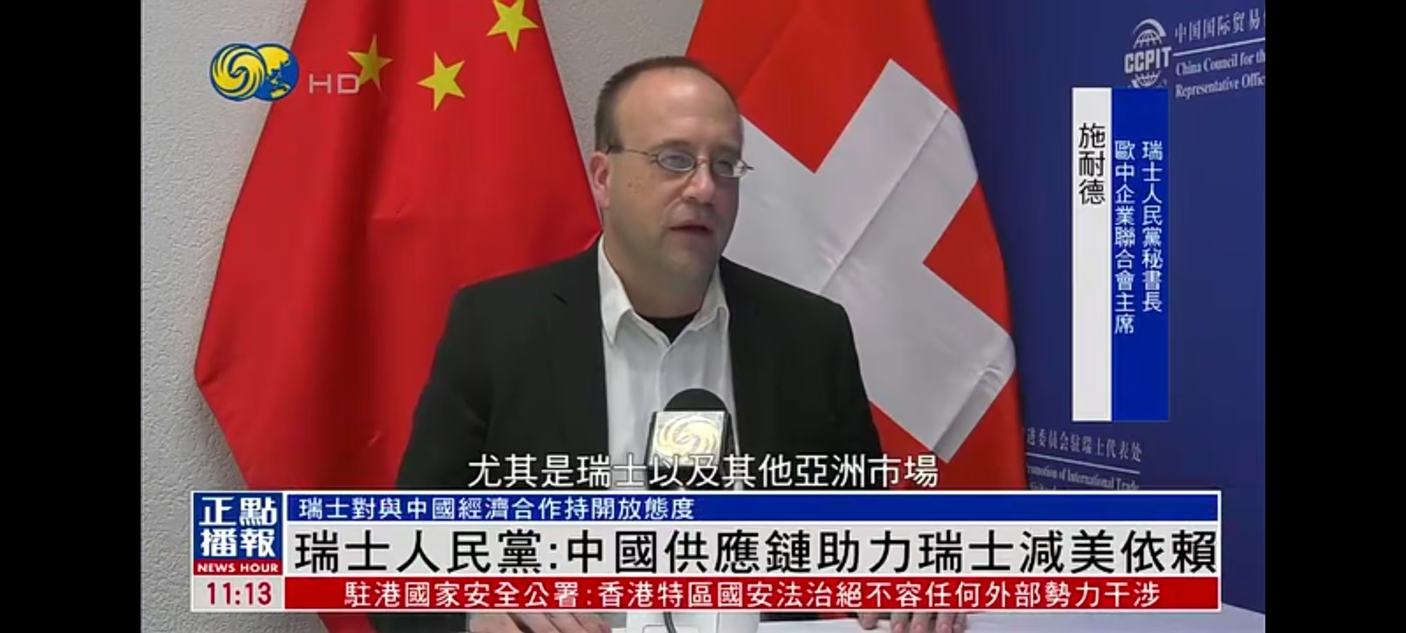 歐中企業(yè)聯(lián)合會(huì)會(huì)長(zhǎng)施耐德在蘇黎世接受了鳳凰衛(wèi)視的采訪